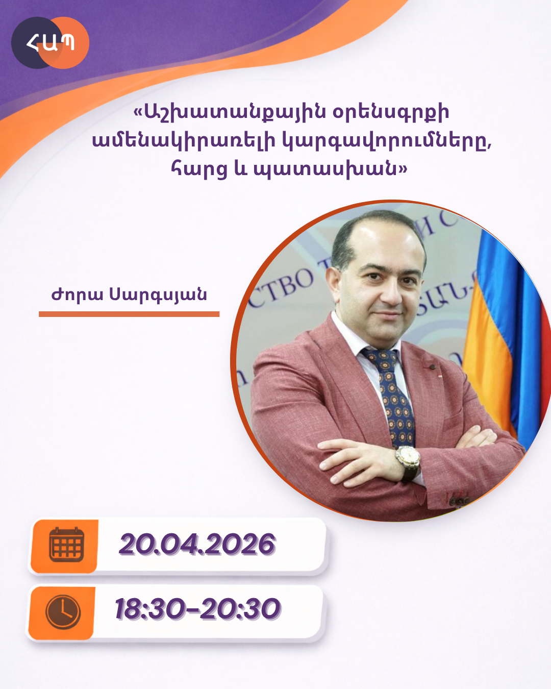 Դասընթացը տեղի կունենա 2026 թվականի ապրիլի 20-ին ժամը 18:30-ից մինչև 20:30, հեռավար: